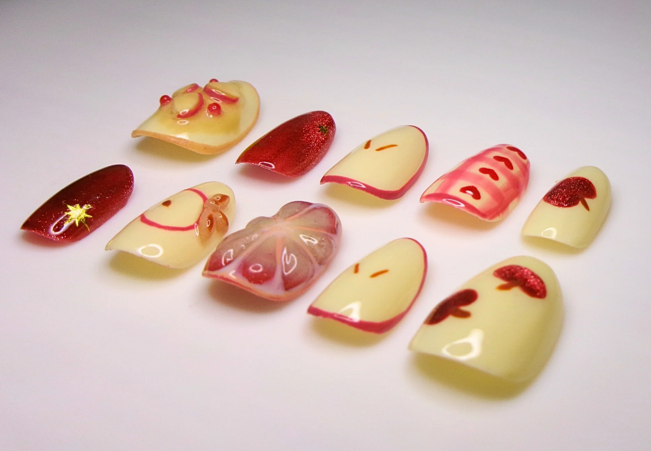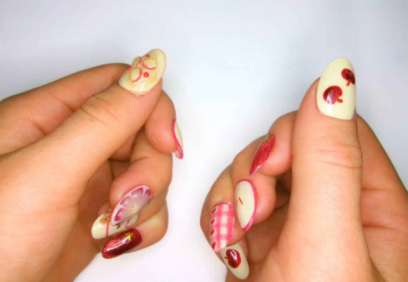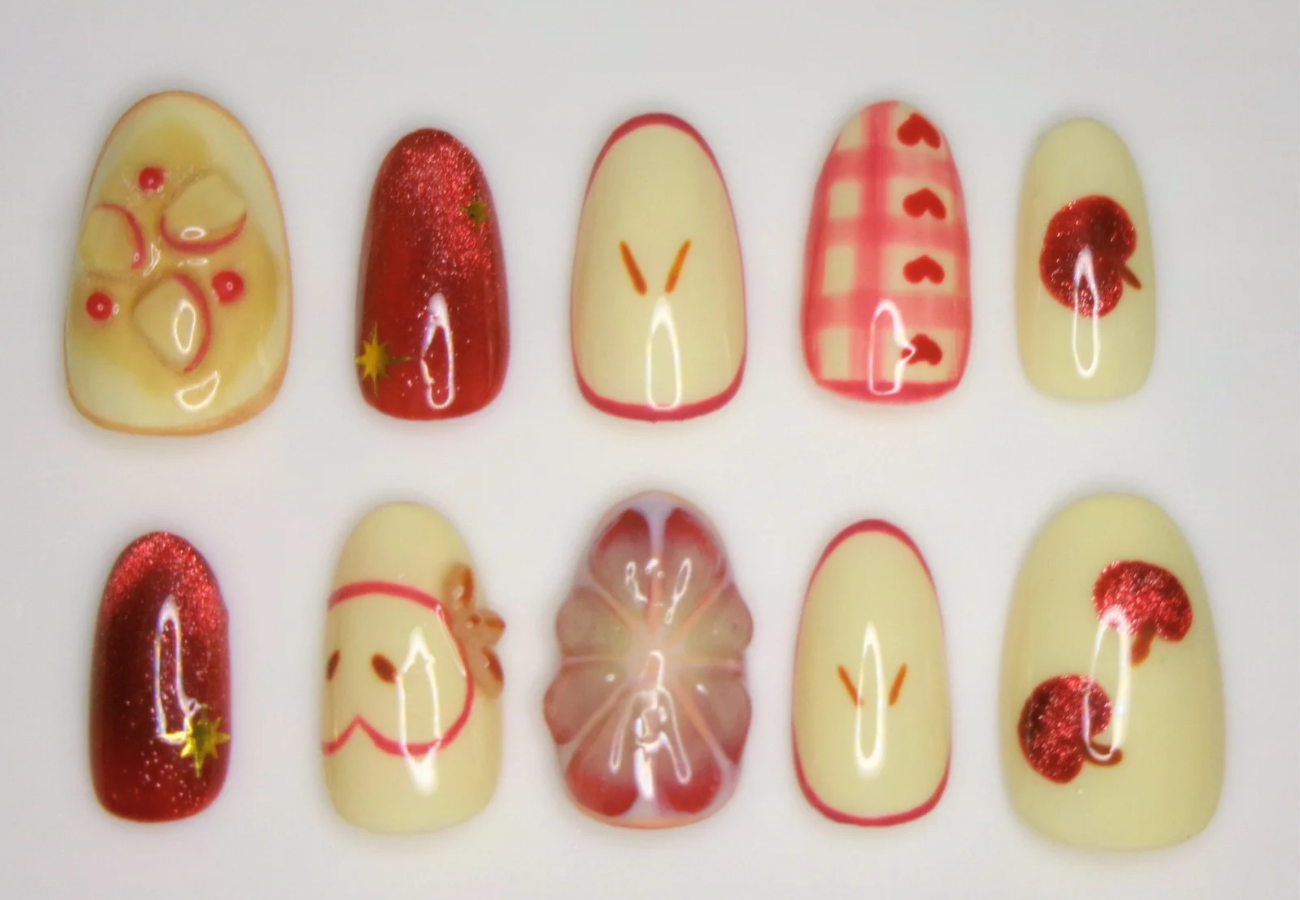 Apple cider, cranberries, and citrus on a nice evening in Autumn. Brown cinnamon with 3D apples and cat-eye gel to give a shimmery glass.